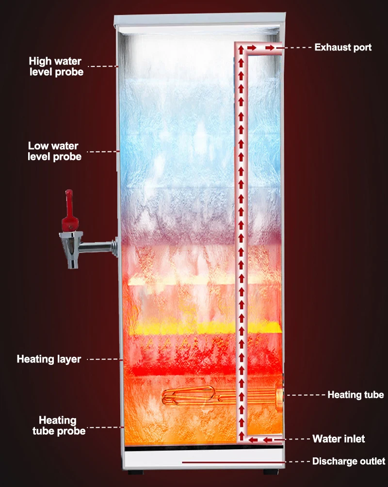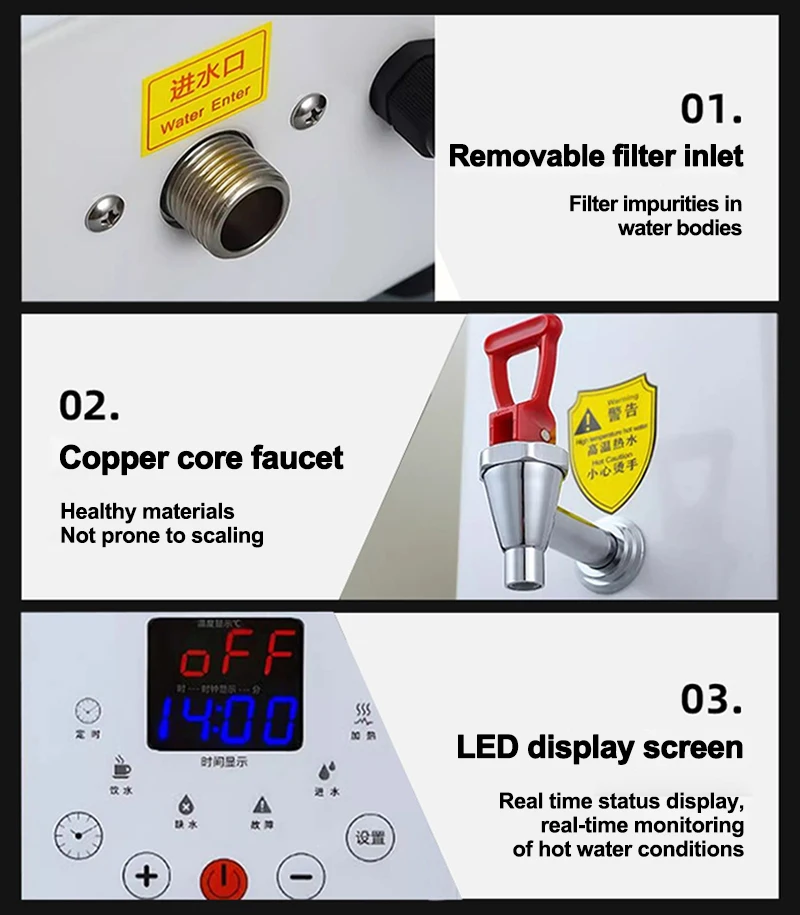 This product is a water boiler suitable for both commercial and household use. (1) Hot water is heated layer by layer,boiling quickly and saving energy. (2) Built in filters remove various impurities,making drinking water healthier. (3) The water inlet,steam hole,and lining are all made of food grade stainless steel material,which is more durable.