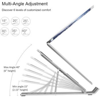 This elegantly simple, sturdy, and easy-to-travel-with laptop stand has six positions ranging from 10 degree tilt to 40 degree tilt.