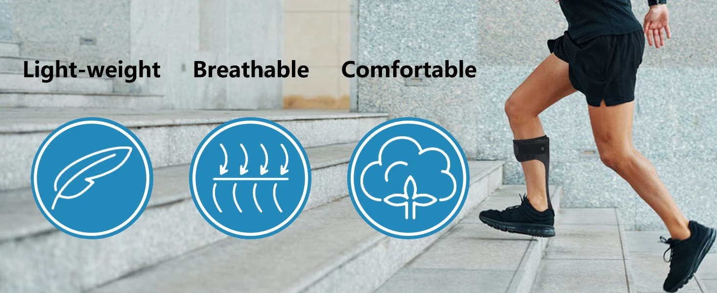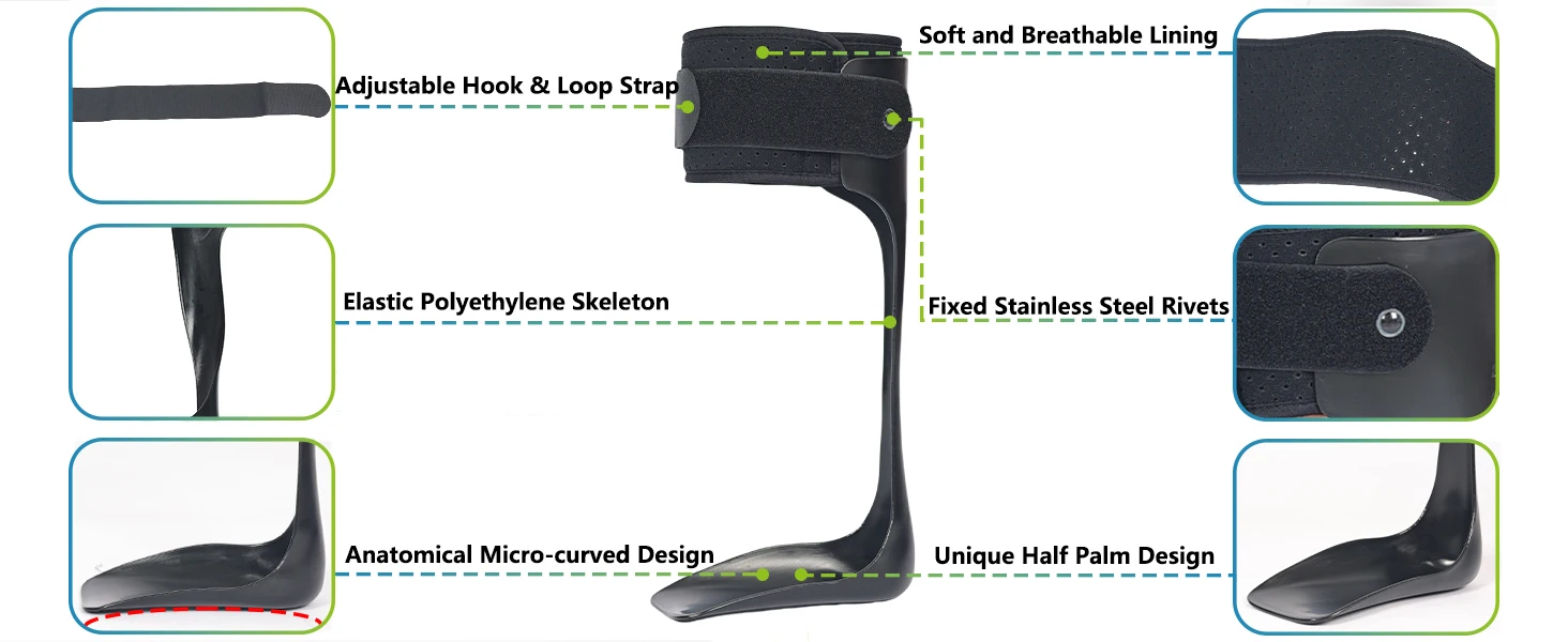The anatomical design of our AFO drop foot brace provides enhanced comfort and support for patients with drop-foot, making walking and ambulation easier and more comfortable. Half-palm footplate, no need to cut, can be used directly in most shoes easily. It is completely unburdened to use and wear.