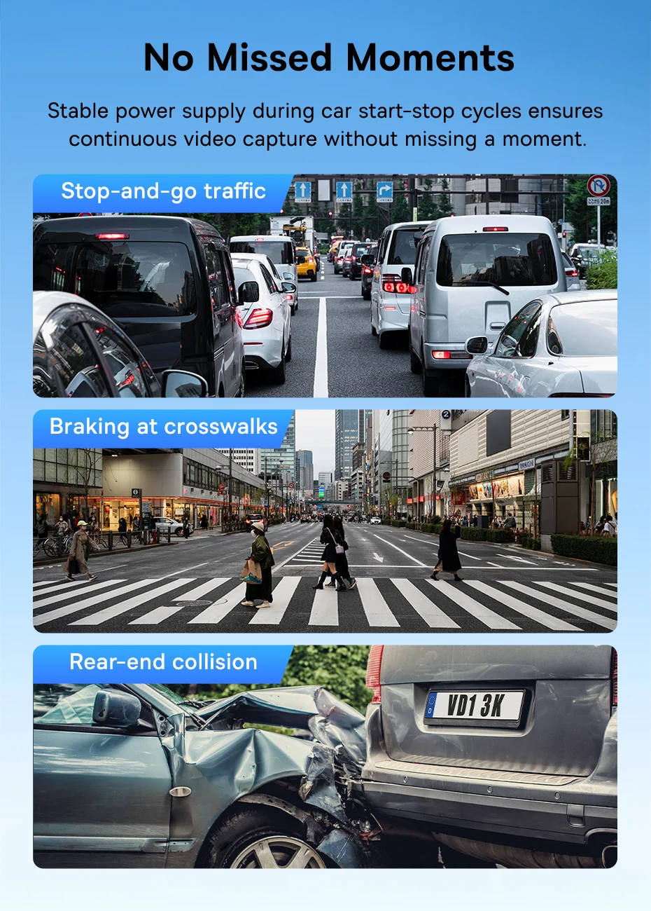 Stable power supply during car start-stop cycles ensures continuous video capture without missing a moment.