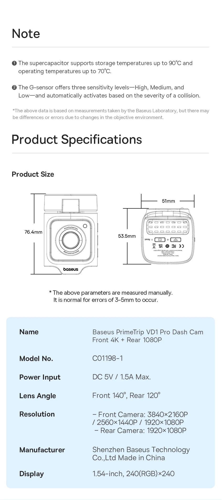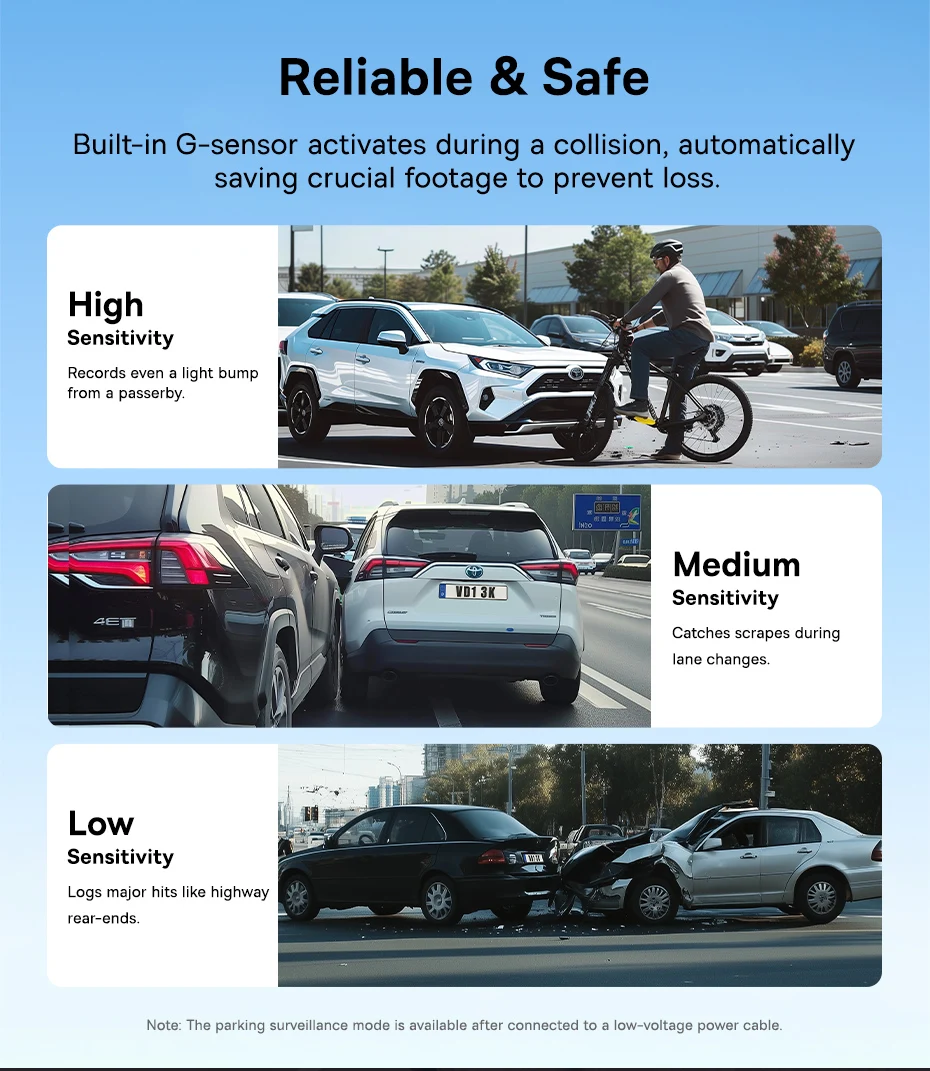Built-in G-sensor activates during a collision, automatically saving crucial footage to prevent loss