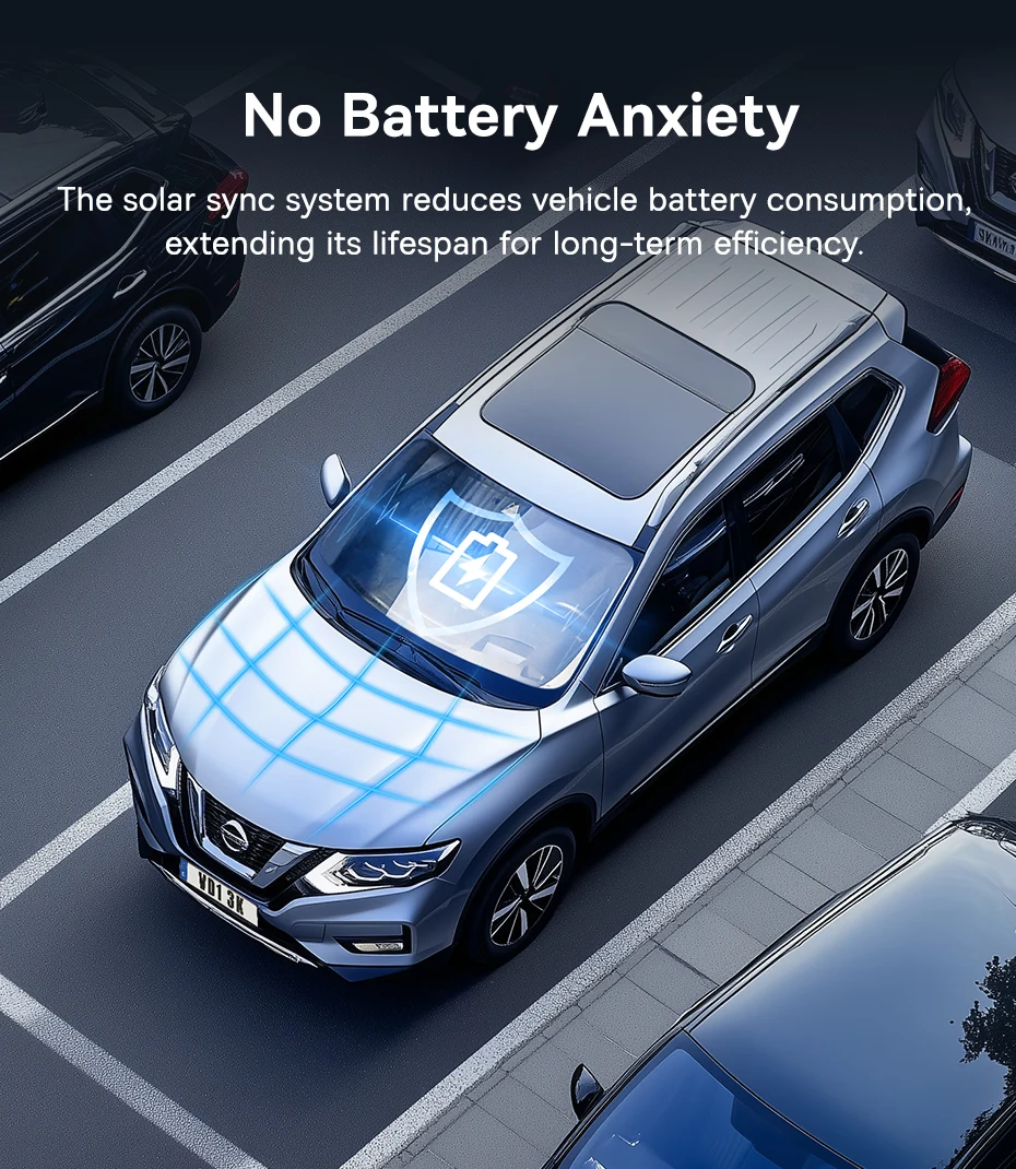 The solar sync system reduces vehicle battery consumption, extending its lifespan for long-term efficiency.
