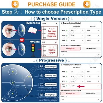 《Progressive》: Only need to fill in the SPH (spherical scope), CYL (cylindrical scope), AXS (axial position), ADD (added value), PD (distance between pupils) areas.