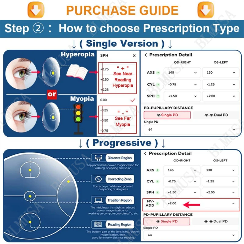 《Progressive》: Only need to fill in the SPH (spherical scope), CYL (cylindrical scope), AXS (axial position), ADD (added value), PD (distance between pupils) areas.