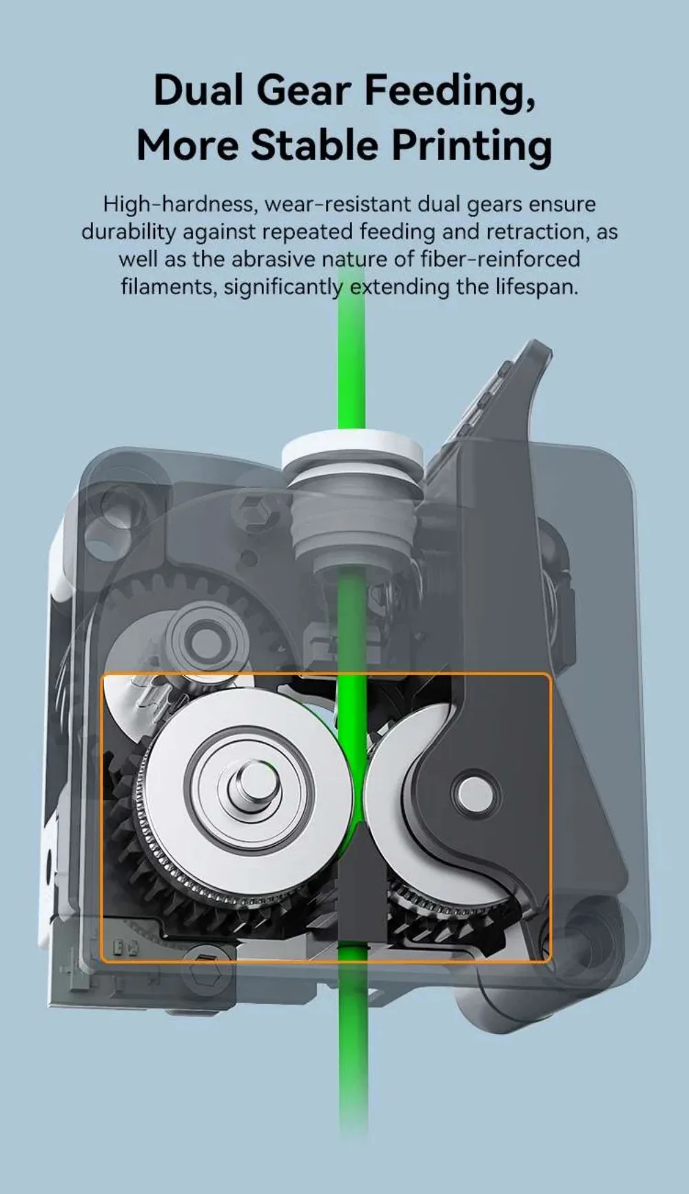 High-hardness, wear-resistant dual gears ensure durability against repeated feeding and retraction, as well as the abrasive nature of fiber-reinforced filaments, significantly extending the lifespan.