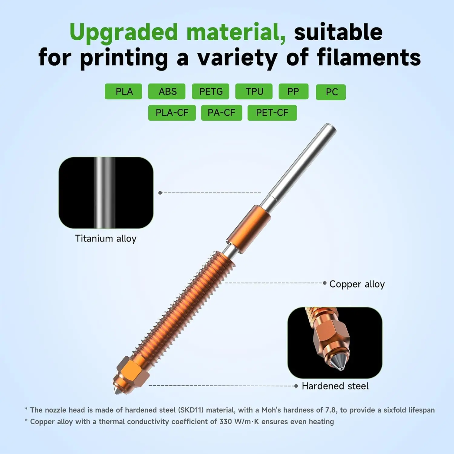 Upgraded Material: The heat break is made of titanium alloy, which can effectively reduce heat conduction. K2P nozzle is made of copper alloy and hardened steel bimetallic material, which has high thermal conductivity and high hardness for better performance. Supports PLA, ABS, PETG, TPU, PP, PC, PLA-CF, PA-CF, PET-CF multiple filament printing