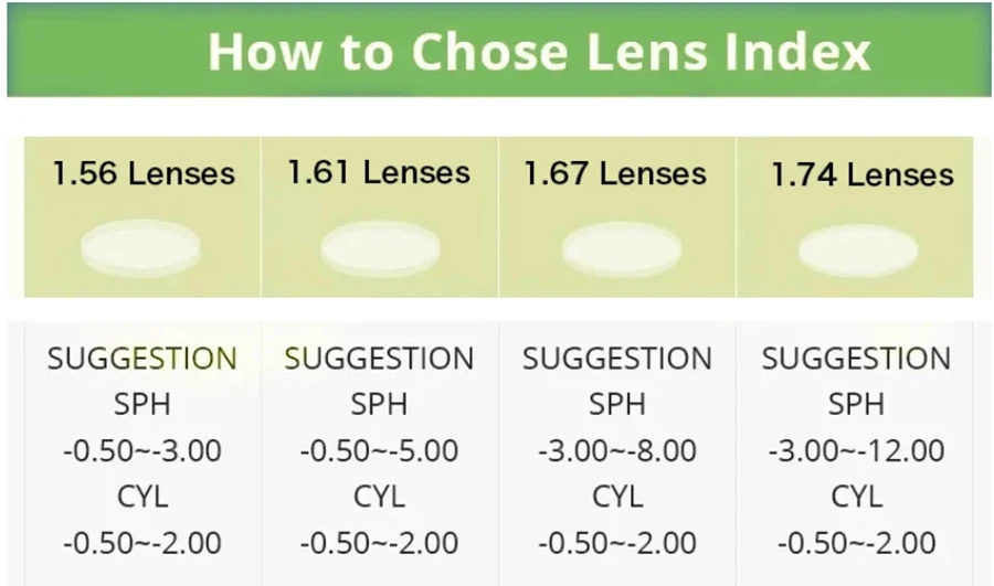 ① If the sum of your SPH and CYL numbers is less than 300 degrees, it is generally recommended to choose lenses with a refractive index of 1.56. Of course, lenses with a refractive index of 1.61/1.67 are also suitable, as they will be thinner and more comfortable to wear.