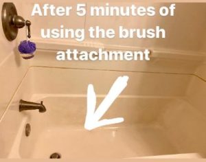 Simply put, this shower is 25 years old and I used to spend 3-4 hours cleaning it by hand every month or two. With this drill brush it took 1.5 hours (literally cut my time in half, if not better) and cleaned it better than I ever could just by hand. Also, I used to use bleach based cleaners and almost pass out for the hours spent in there. Now? It cleans so well I use all natural cleaners. This time around I used simple green. Nothing else. Worked amazingly. Don’t take my word for it, let the photo of my 25 year old bath tub do the talking for you.