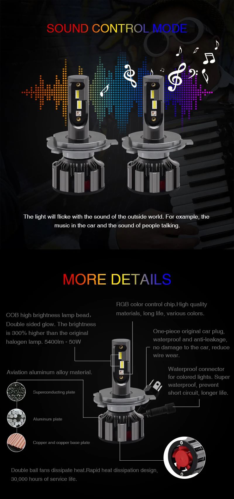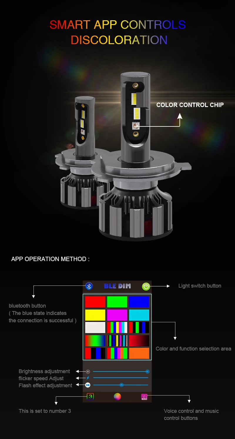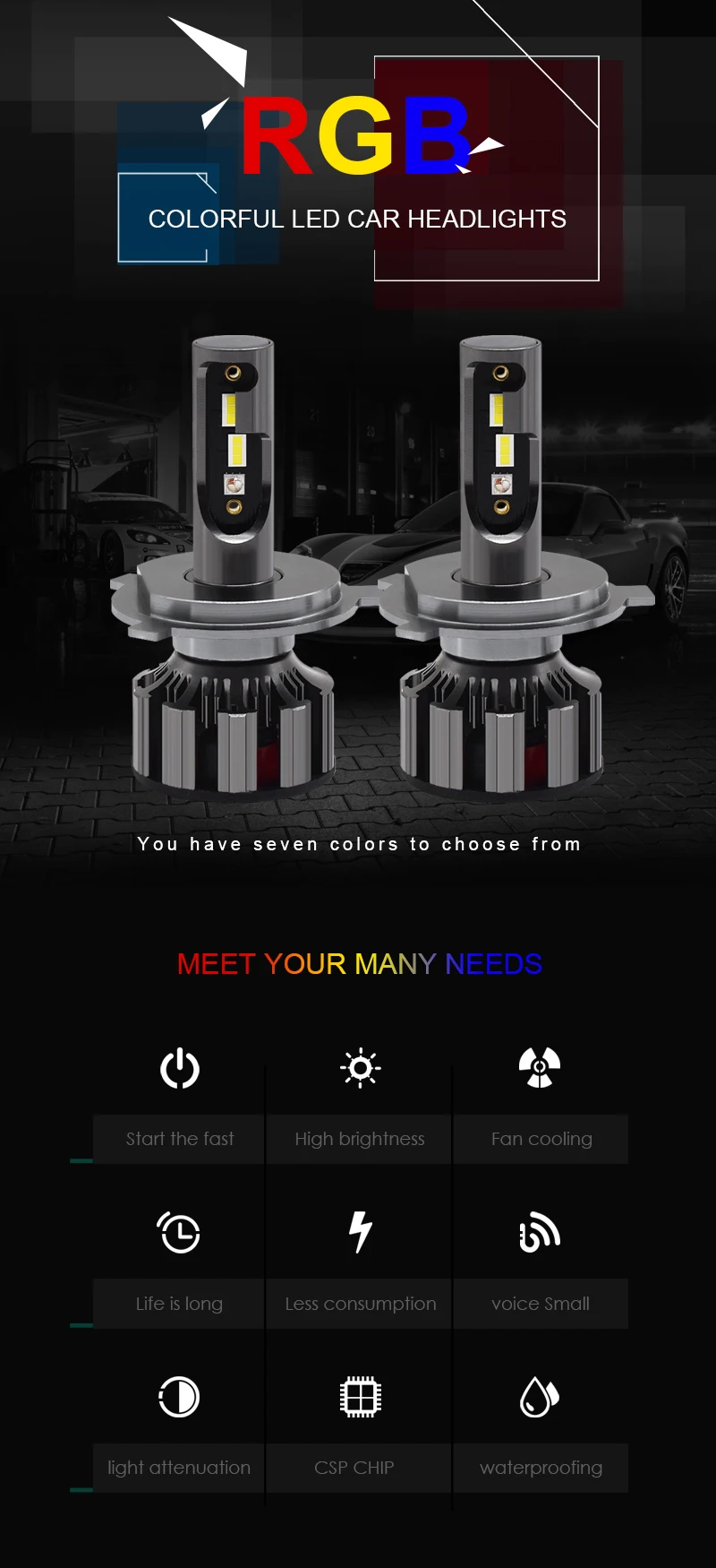 EURS 2PCS RGB Car headlight APP Bluetooth Control H4 H7 LED H1 H3 H8 H11 HB3 HB4 D2S D3S LED Light Auto Headlamp Colorful Bulbs