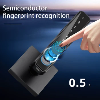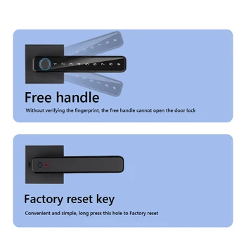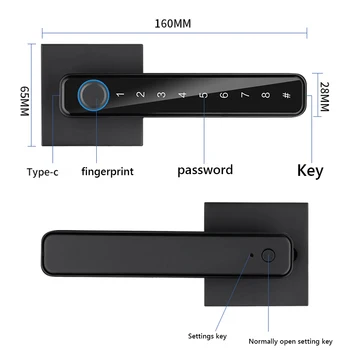 Feature: 1. Multiple Unlocking Methods: Including semiconductor fingerprint, digital password, traditional mechanical backup keys (2), TUYA/TTLOCK mobile Bluetooth app (optional). Both the elderly and children can use it, targeting different scenes and groups of people. Quick unlocking is available in multiple ways for you to use. 2. Smartphone App: Easily achieve intelligent life with home connectivity. User management – Add, delete users, change permissions; User password management – time setting, deletion, and viewing status; Control the unlocking record at all times, and remotely view the lock history through the mobile app; No need for internet connection, remote password sending to relatives and friends to unlock. 3. Normally Open Mode: Normally open mode, accessible at any time. It can be switched to the normally open mode, and can be opened directly without verification, making it convenient for different scenarios to use. Press the handle normally open button for 1 second to switch to normally open mode. 4. Emergency Charging Port and Backup Key: When the battery is severely low or completely depleted, don’t worry. You can use the backup key to open the door and come with a USB-C charging port. It can also be connected to a mobile power source for temporary power supply. The door lock adopts a free handle design, which can prevent malicious violence from damaging the lock body and internal parts. The handle can be interchanged left and right; When entering the house, touch the password button to light up the screen, which is practical and convenient. 5. Anti-peeping Design: Fake password anti peeping design, input any password before and after the correct password, and only need to continuously input the correct password in the middle to open the door, effectively ensuring the personal safety of you and your family. High quality aluminum alloy lock head with sturdy structure to prevent illegal unlocking. Strong load-bearing capacity; Thickening and hardening, locking design to prevent external damage from others.