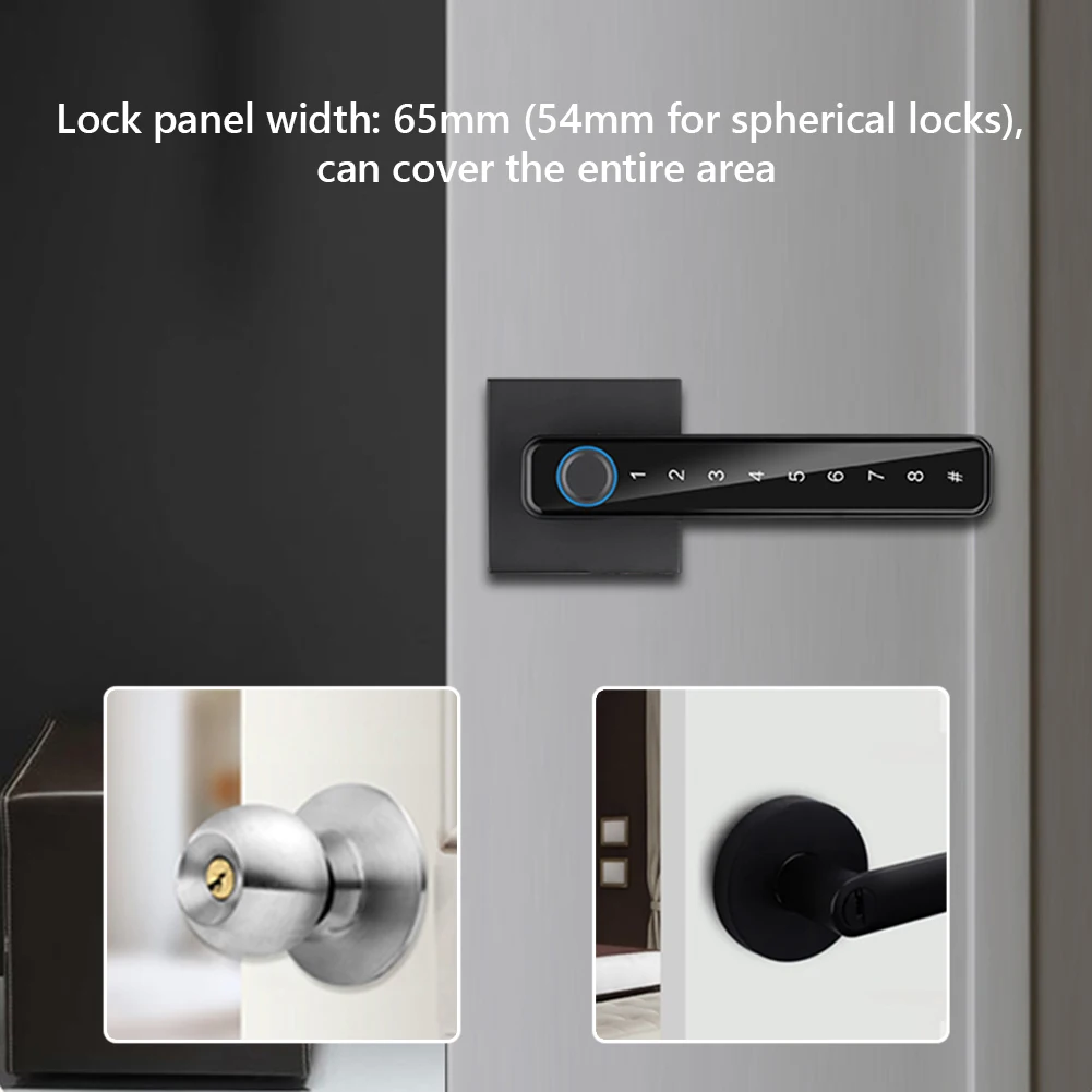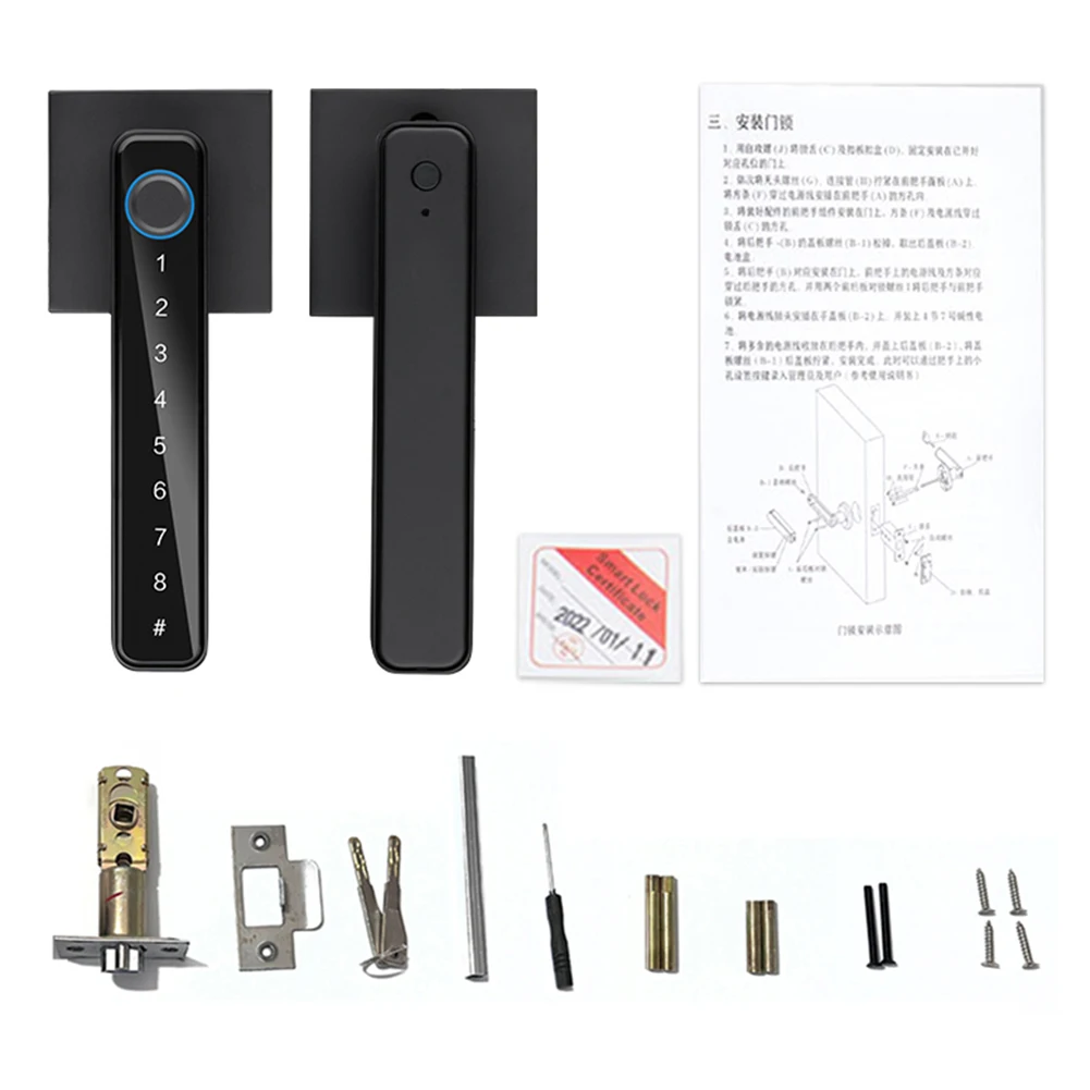 Feature: 1. Multiple Unlocking Methods: Including semiconductor fingerprint, digital password, traditional mechanical backup keys (2), TUYA/TTLOCK mobile Bluetooth app (optional). Both the elderly and children can use it, targeting different scenes and groups of people. Quick unlocking is available in multiple ways for you to use. 2. Smartphone App: Easily achieve intelligent life with home connectivity. User management – Add, delete users, change permissions; User password management – time setting, deletion, and viewing status; Control the unlocking record at all times, and remotely view the lock history through the mobile app; No need for internet connection, remote password sending to relatives and friends to unlock. 3. Normally Open Mode: Normally open mode, accessible at any time. It can be switched to the normally open mode, and can be opened directly without verification, making it convenient for different scenarios to use. Press the handle normally open button for 1 second to switch to normally open mode. 4. Emergency Charging Port and Backup Key: When the battery is severely low or completely depleted, don’t worry. You can use the backup key to open the door and come with a USB-C charging port. It can also be connected to a mobile power source for temporary power supply. The door lock adopts a free handle design, which can prevent malicious violence from damaging the lock body and internal parts. The handle can be interchanged left and right; When entering the house, touch the password button to light up the screen, which is practical and convenient. 5. Anti-peeping Design: Fake password anti peeping design, input any password before and after the correct password, and only need to continuously input the correct password in the middle to open the door, effectively ensuring the personal safety of you and your family. High quality aluminum alloy lock head with sturdy structure to prevent illegal unlocking. Strong load-bearing capacity; Thickening and hardening, locking design to prevent external damage from others.