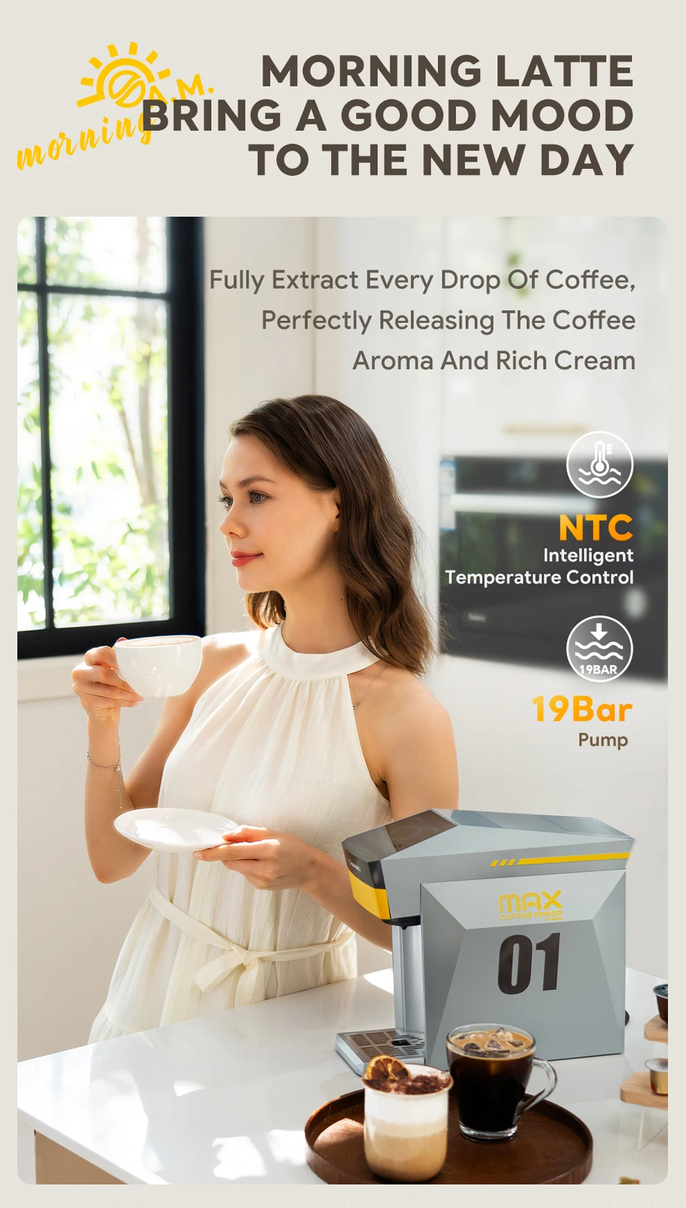 3. With a 19BAR high-pressure design, under the effect of high pressure, fresh coffee allows water to fully permeate the coffee powder, extracting coffee substances and rich oil, resulting in a mellow-tasting coffee.
