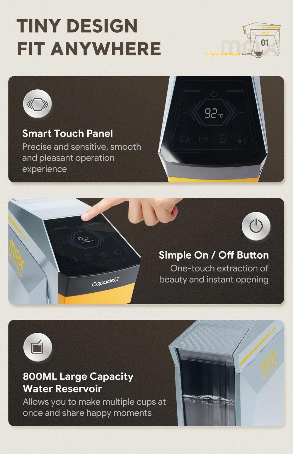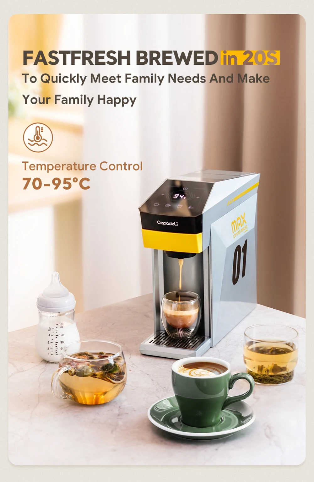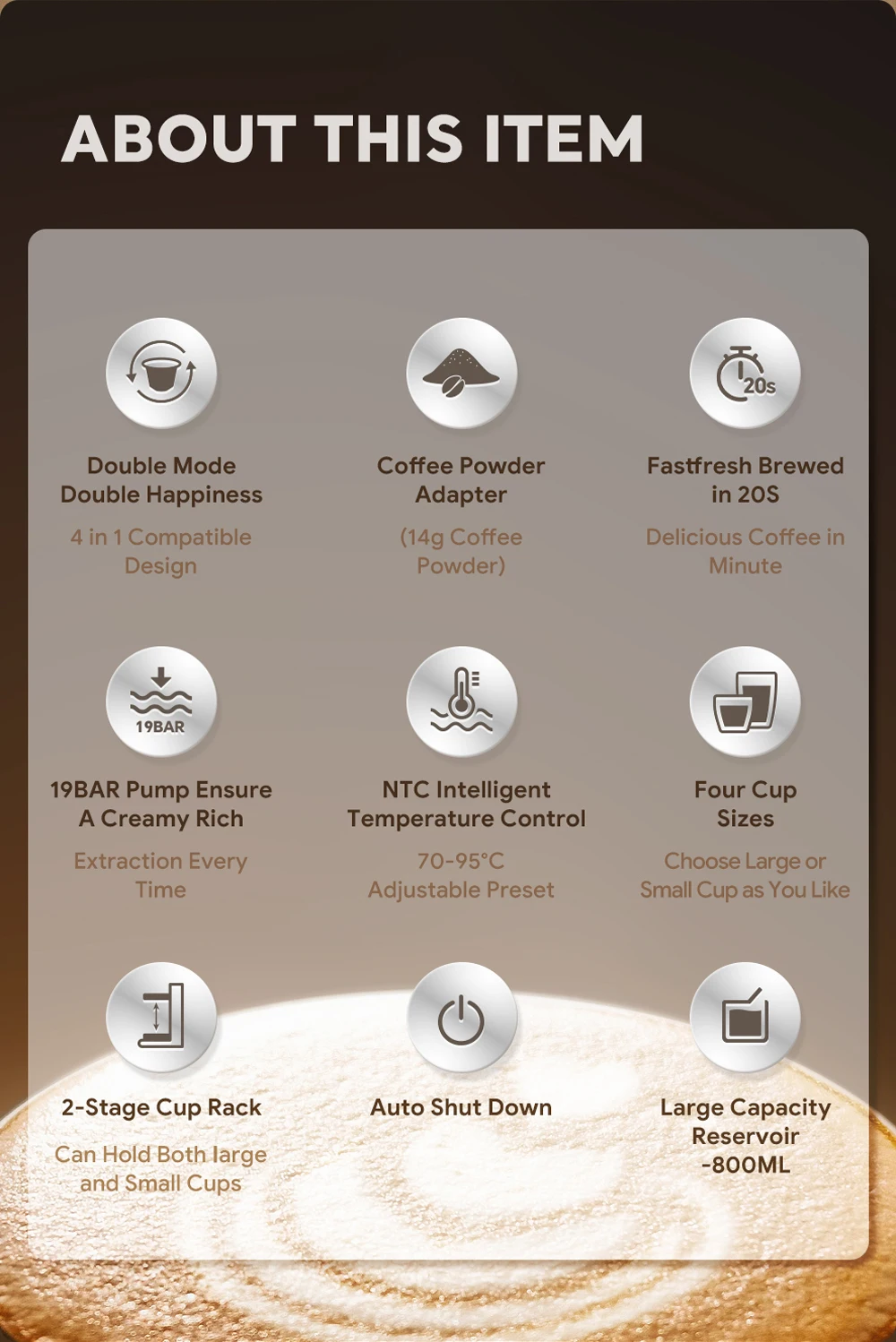 4. “NTC intelligent temperature control, adjustable preset within 70-95°,” enables precise temperature control, allowing you to customize your own coffee taste.