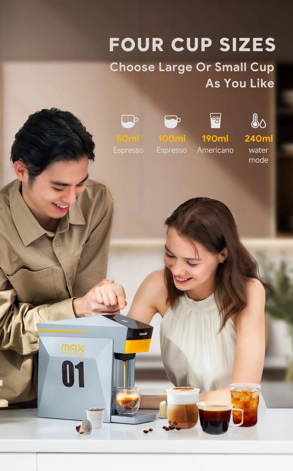 6. The simple operation panel is clear and straightforward, offering 4 options: approximately 50ml/100ml concentrated, 190ml American, and 240ml hot water, which can satisfy your diverse needs.