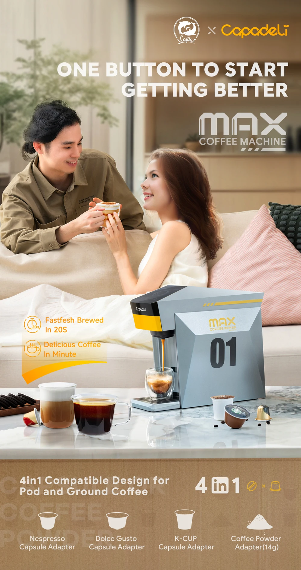 1. This 5-in-1 multifunctional coffee machine serves multiple purposes in one device, saving both space and money. It is compatible with 4 types of capsules such as Nespresso, Dolce Gusto, Kcup, and ground coffee.