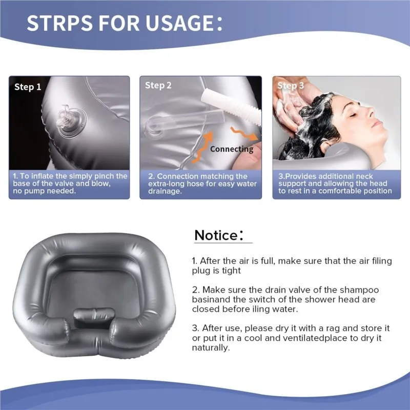 Instead of rinsing shampoo, bathing caps, or messy sponges, you can now use an inflatable shampoo tub to provide truly clean shampoo to the people you care about. It is fast to set up, easy to use, and most importantly, comfortable for users. Ideal for elderly, bedridden, or ambulatory/postoperative patients.
