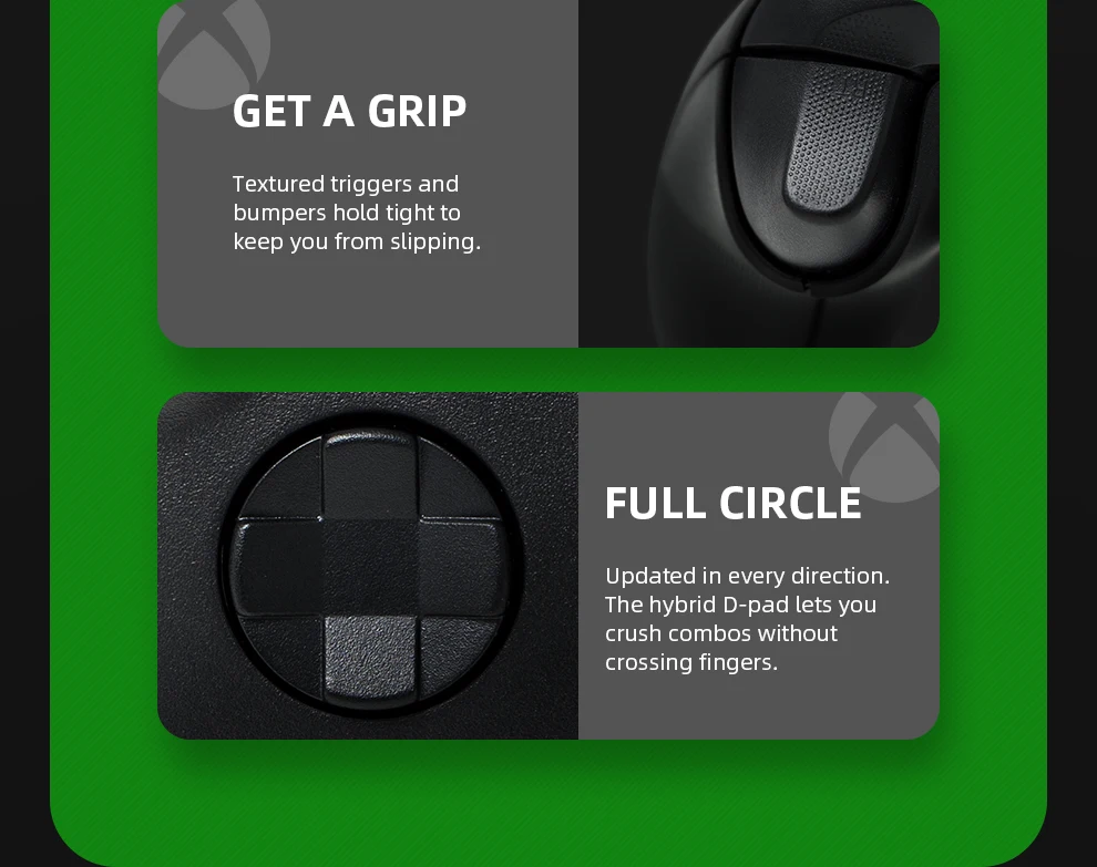 Stay on target with the hybrid D-pad, textured grip on the triggers, bumpers, and back-case. Plug in any compatible headset with the 3.5mm audio headset jack.