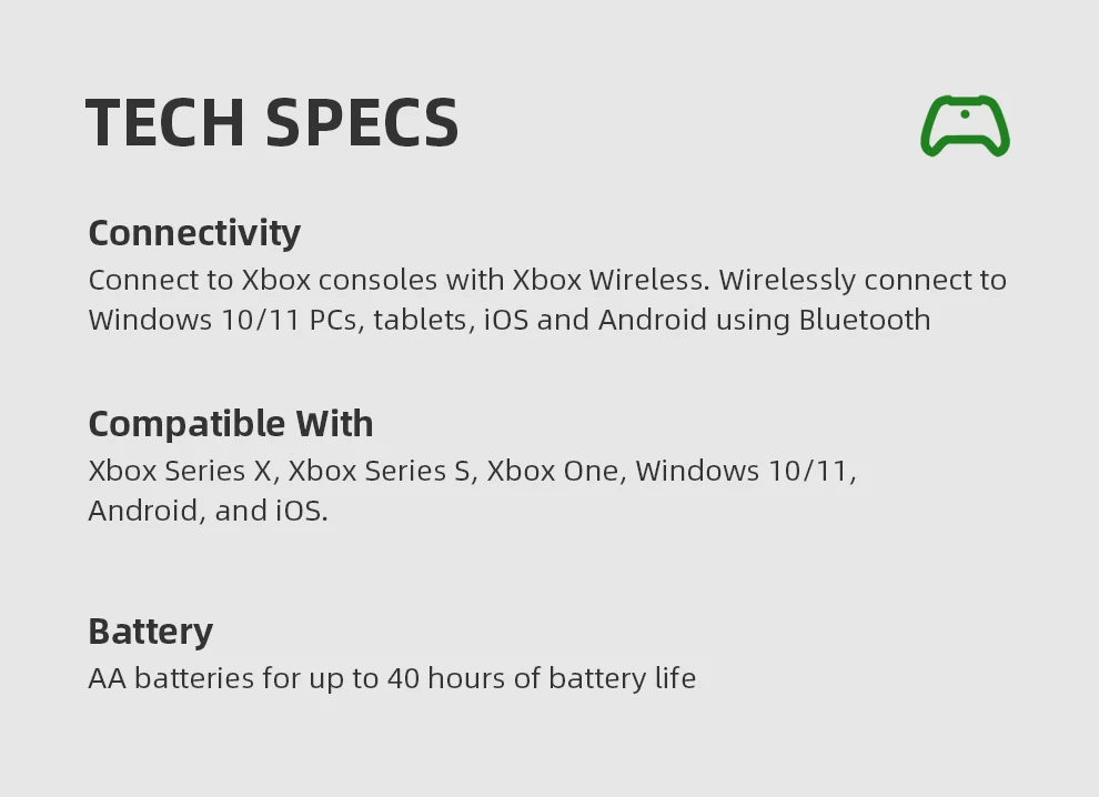 Compatible with Xbox Series X|S, Xbox One, and Windows 10/11 devices.
