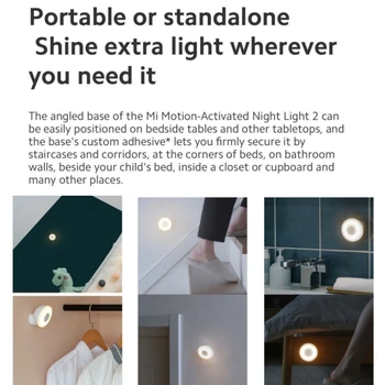 The angled base of the Mi Motion-Activated Night Light 2 can be easily positioned on bedside tables and other tabletops, and thebase's custom adhesive* lets you frmly secure it by staircases and coridors, at the corners of beds, on bathroom walls, beside yourchild's bed inside a closet or cupboard and many other places