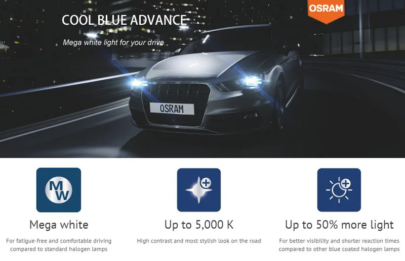 Seeking the ultimate in style but don’t want to compromise on brightness? Choose the new OSRAM Cool Blue Advance. The range produces a colour temperature of up to 5000K, plus delivers up to 50% extra brightness on the road than standard. Choose OSRAM Cool Blue Advance and you’ll benefit from the best of both worlds: a stylish, white light with extra light output.