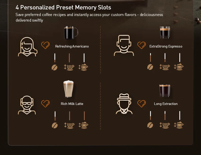 4 Personalized Preset Memory Slots: Save and instantly access your custom coffee recipes.