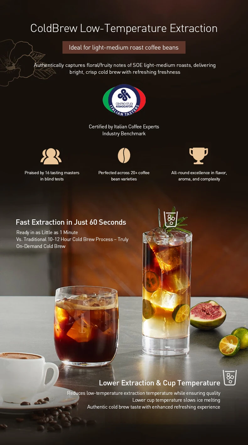 ColdBrew Low-Temperature Extraction: Innovative system for light-medium roast beans. Authentically captures floral/fruity notes of SOE beans for bright, crisp cold brew.
