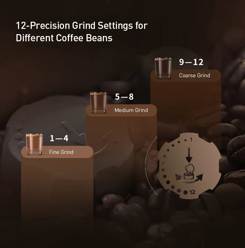 Grind Settings: 12 precision steps (1-4: Fine, 5-8: Medium, 9-12: Coarse)