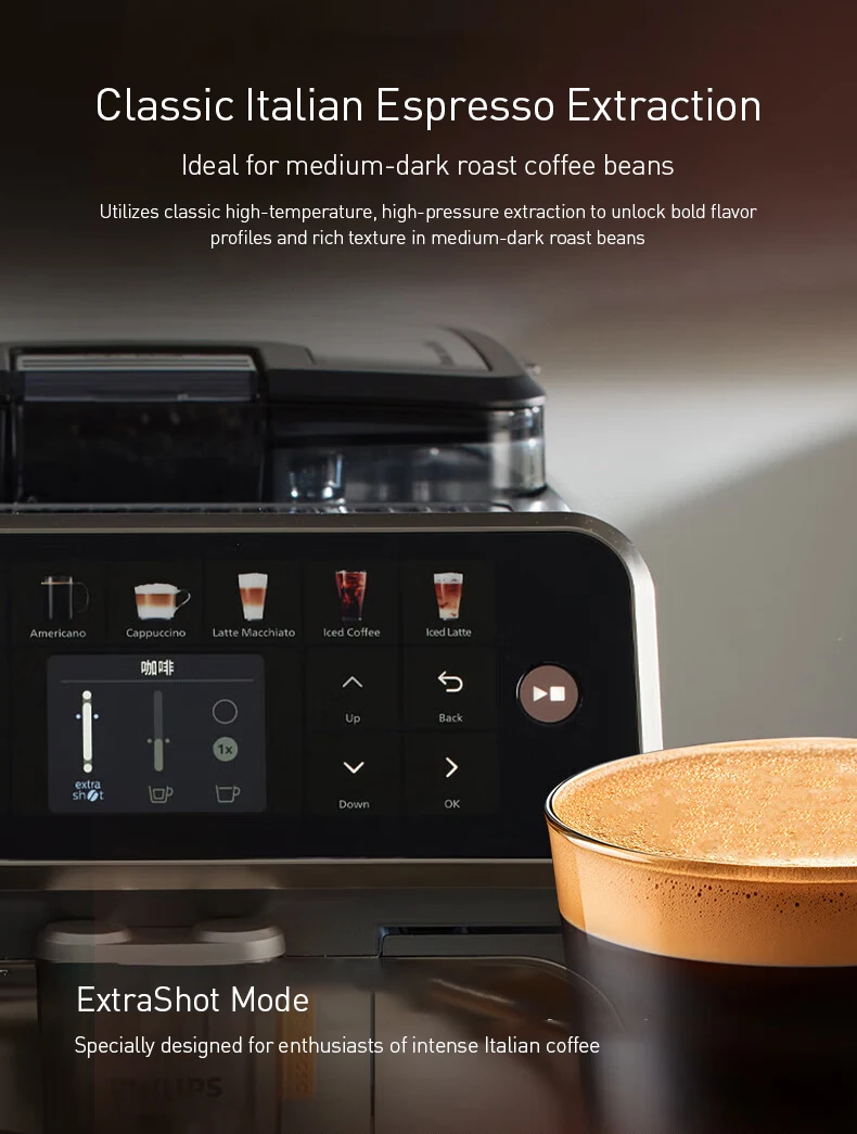 Classic Italian Espresso Extraction: High-temperature, high-pressure extraction ideal for medium-dark roast beans, delivering bold flavors and rich texture.