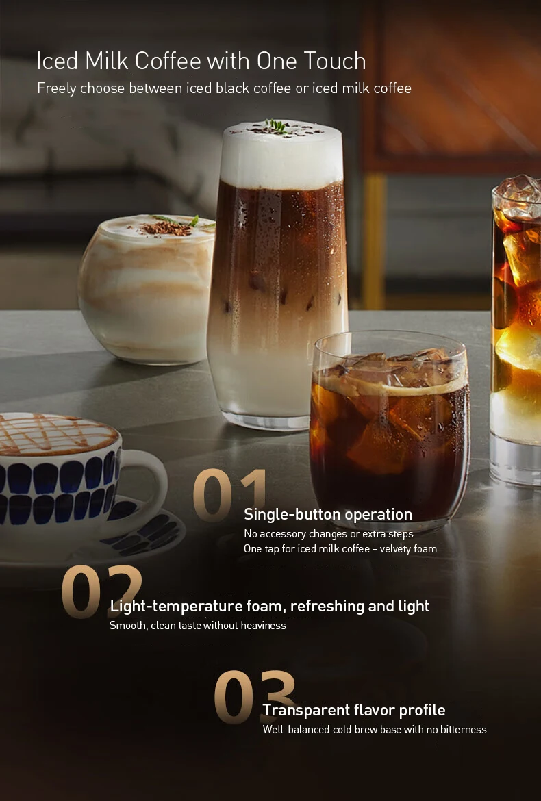 One-Touch Iced Milk Coffee: Single-button operation for iced milk coffee with velvety foam, no accessory changes needed.