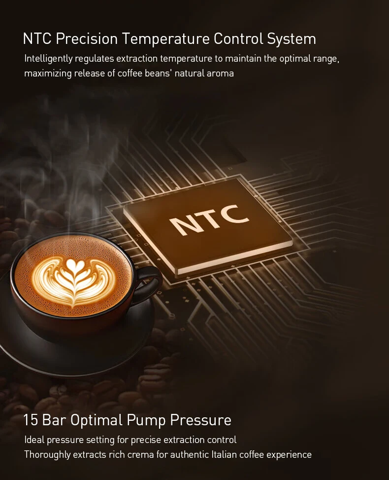 NTC Precision Temperature Control: Intelligently regulates extraction temperature to maximize the release of coffee beans' natural aroma.