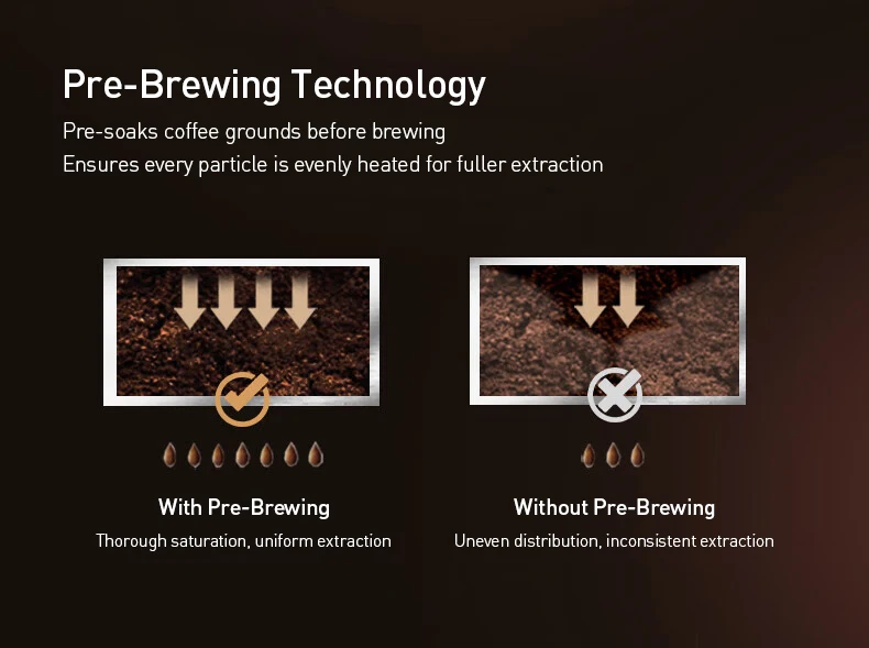 Pre-Brewing Technology: Pre-soaks coffee grounds before brewing to ensure even heating and fuller, more uniform extraction.