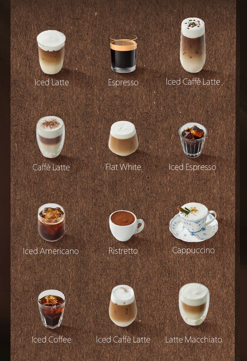 Drink Options Include: Espresso, Iced Espresso, Coffee, Americano, Iced Americano, Ristretto, Caffè Latte, Iced Caffè Latte, Cappuccino, Latte Macchiato, Flat White, Iced Coffee. Also provides direct hot water and warm milk foam.