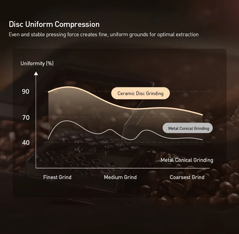 Disc Uniform Compression: Creates fine, uniform grounds for optimal and consistent extraction (higher uniformity % than conical grinders).