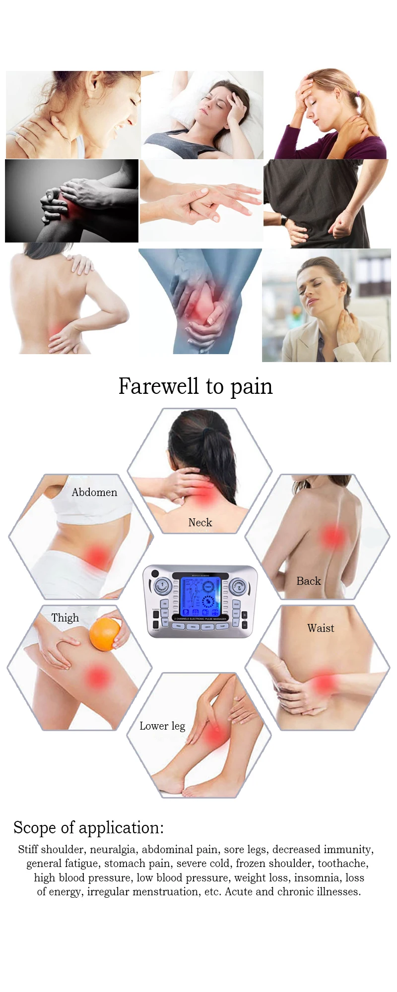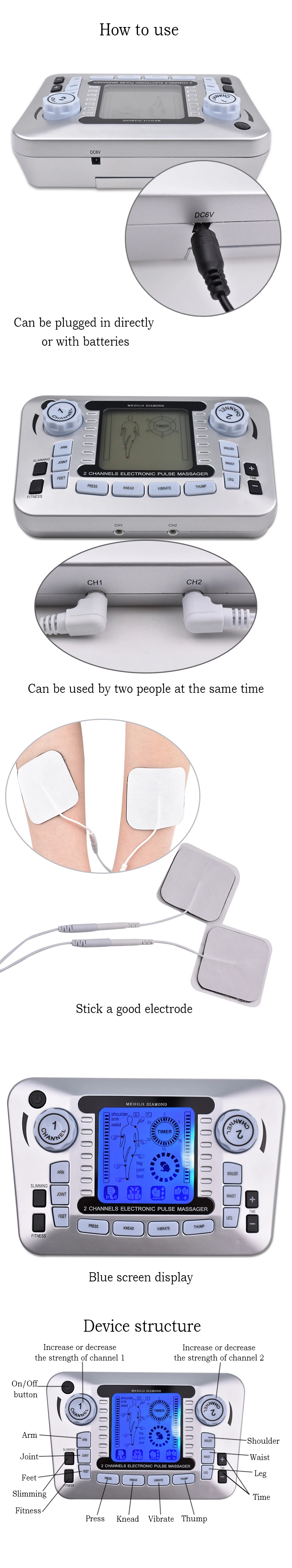 2.Stick the electrode pads onto appropriate parts of the body that need to be massaged, and then connect conducting wire with electrode pads correctly.