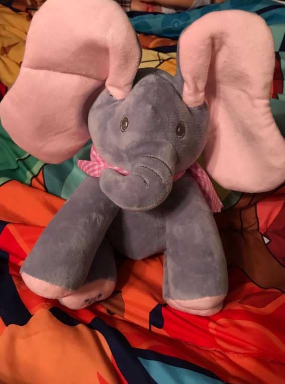 My daughter received this as a gift and let me tell you, it is THE cutest singing stuffed animal i have ever seen! It’s such great quality, so so soft and well made and the voice is super cute. (Not creepy like some!!) The elephant’s ears move to the music and play peek-a-boo with baby. It’s held up great so far even with my 1.5-year-old pulling on the ears and pushing the buttons a hundred times a day! We show this off to everyone! I think it will become my go-to baby gift for friends now, and would definitely purchase another one if anything were to happen to ours. I am shocked at the price, something this great of quality and cuteness would generally be upwards of $35-40, so at this price is the perfect buy!!